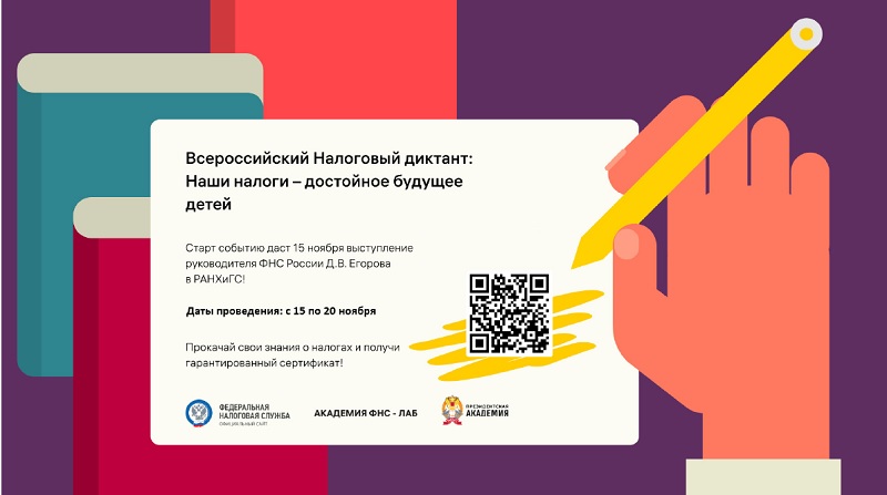 Федеральная налоговая служба и Российская академия народного хозяйства и государственной службы при Президенте РФ с 15 по 20 ноября 2022 года проводит Всероссийский Налоговый диктант «Наши налоги – достойное будущее детей» (далее – Диктант), призванный развить интерес к налоговым знаниям и определить фактическое состояние уровня налоговой грамотности.