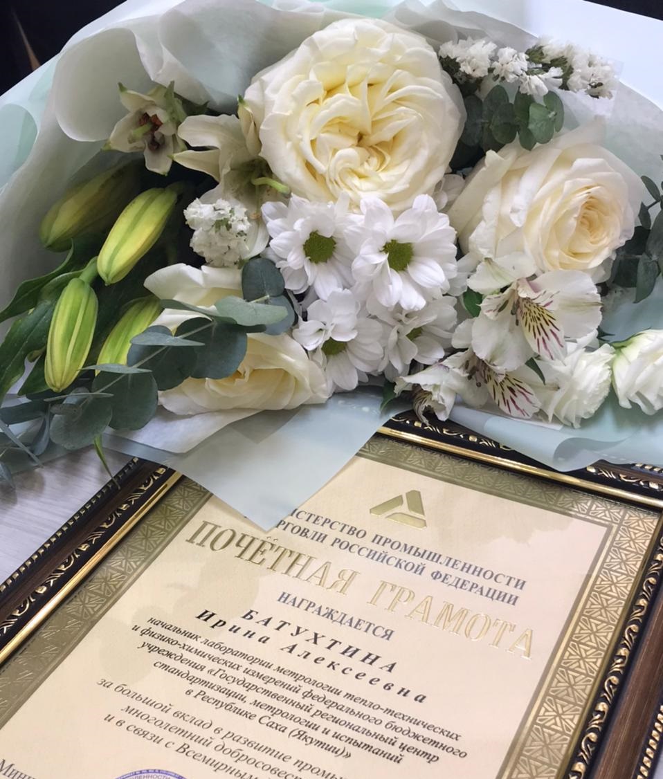 В преддверии празднования Всемирного дня стандартизации директор ФБУ «Якутский ЦСМ» наградил Почетной грамотой Министерства промышленности и торговли Российской Федерации Батухтину Ирину Алексеевну начальника лаборатории метрологии тепло-технических и физико-химических измерений федерального бюджетного учреждения «Государственный региональный центр стандартизации, метрологии и испытаний в Республике Саха (Якутия)».